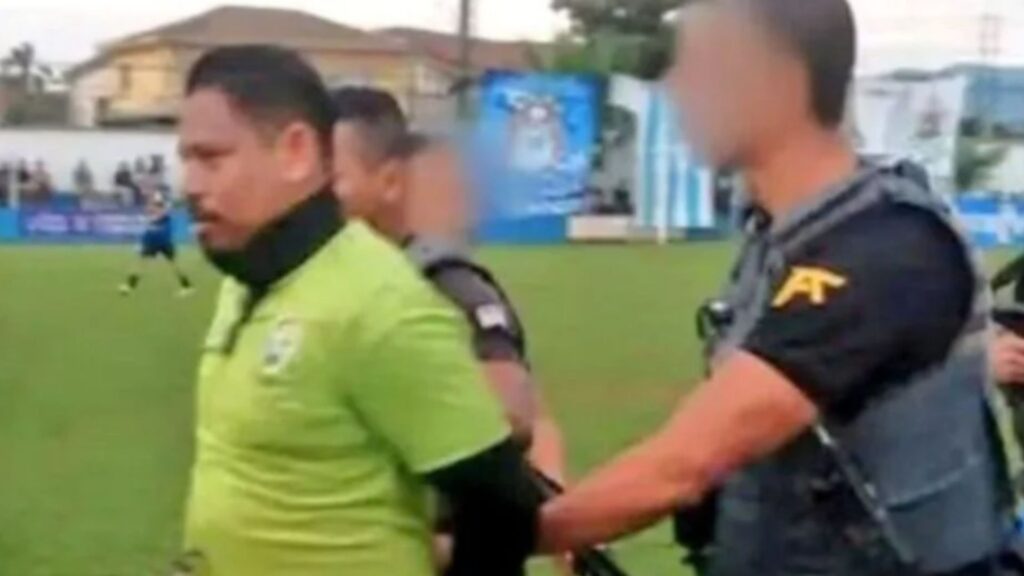 Dalam insiden mengejut itu, Ederson Carlos da Silva, 38, sedang mengadili perlawanan Ahad lalu apabila sekumpula polis berpakaian kalis peluru menyerbu padang dan menggarinya di hadapan pemain dan penonton.