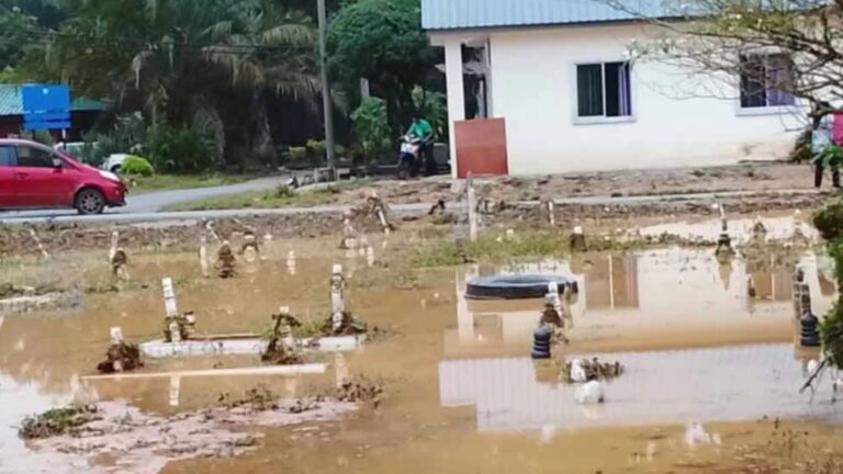 BUKIT GANTANG: Jenazah yang sudah dikebumikan timbul semula ke permukaan tanah kesan banjir kilat yang melanda Trong dalam daerah Larut, Matang dan Selama (LMS) di sini.