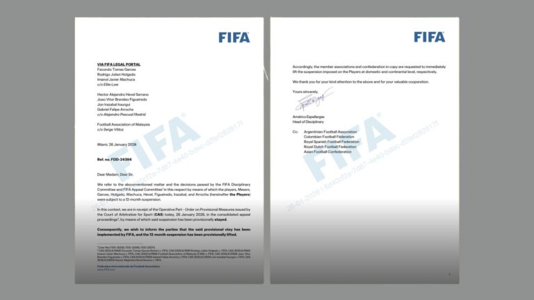 KUALA LUMPUR: Persatuan Bolasepak Malaysia (FAM) melampirkan surat rasmi daripada FIFA yang menggesa persatuan atau badan induk yang terlibat untuk segera mematuhi keputusan Mahkamah Timbang Tara Sukan (CAS) itu.