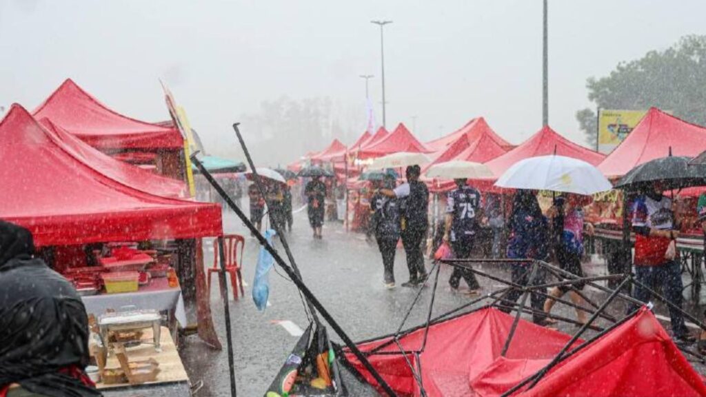 Peniaga dan pengunjung dilihat berlindung di bawah khemah yang masih berdiri, dengan beberapa peniaga juga cuba menyelamatkan peralatan mereka selepas ribut melanda.