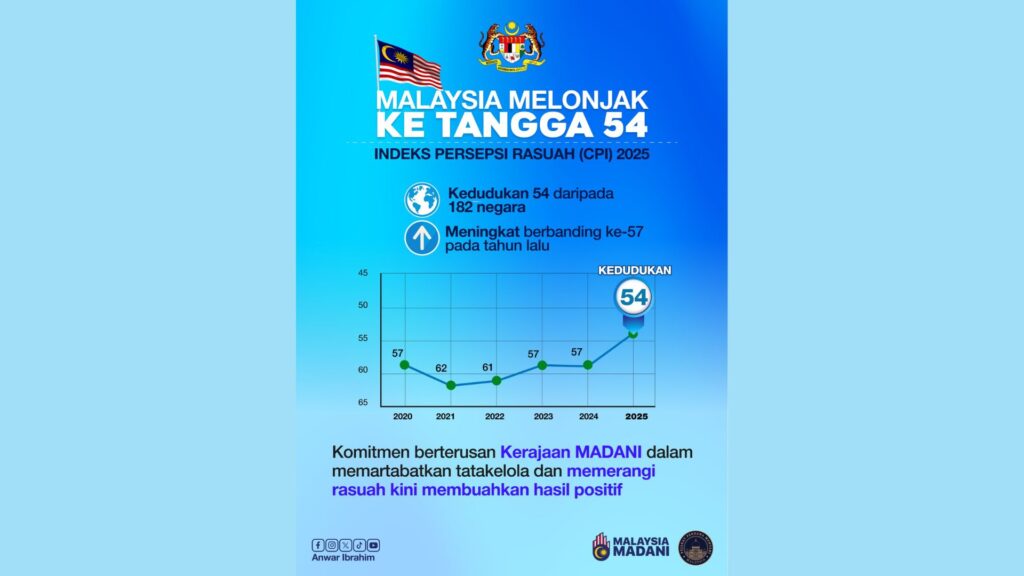 SHAH ALAM: Malaysia naik tangga ke-54 dalam Indeks Persepsi Rasuah (CPI) 2025, menunjukkan peningkatan berbanding ke-57 pada tahun sebelumnya.