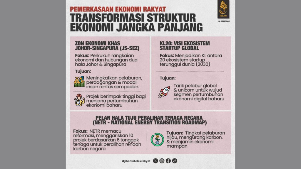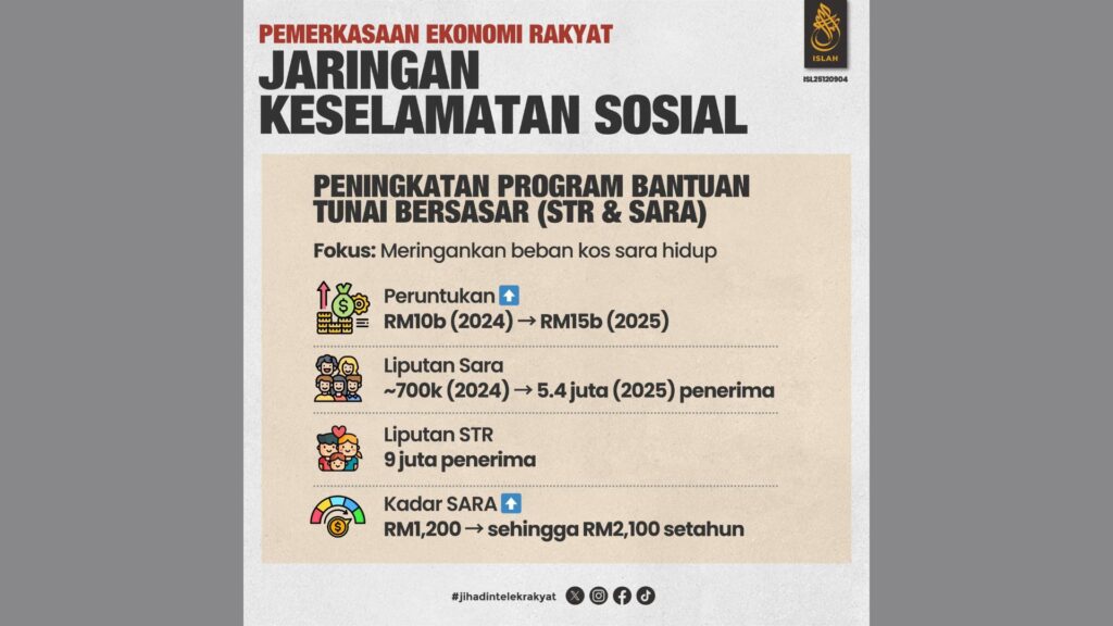 Kerajaan memperkukuh jaringan keselamatan sosial melalui perlindungan kesihatan universal, bantuan kewangan bersasar, program latihan semula, serta sokongan kepada warga emas dan OKU.