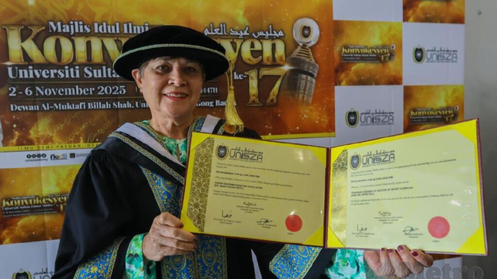 KUALA NERUS: Sebagai mengiktiraf pendidikan tertinggi dalam usahanya membangunkan sukan tanah air, legenda olahraga negara, Datuk Marina Chin dianugerah Ijazah Kehormat Doktor Sains Sukan daripada Universiti Sultan Zainal Abidin (UniSZA).
