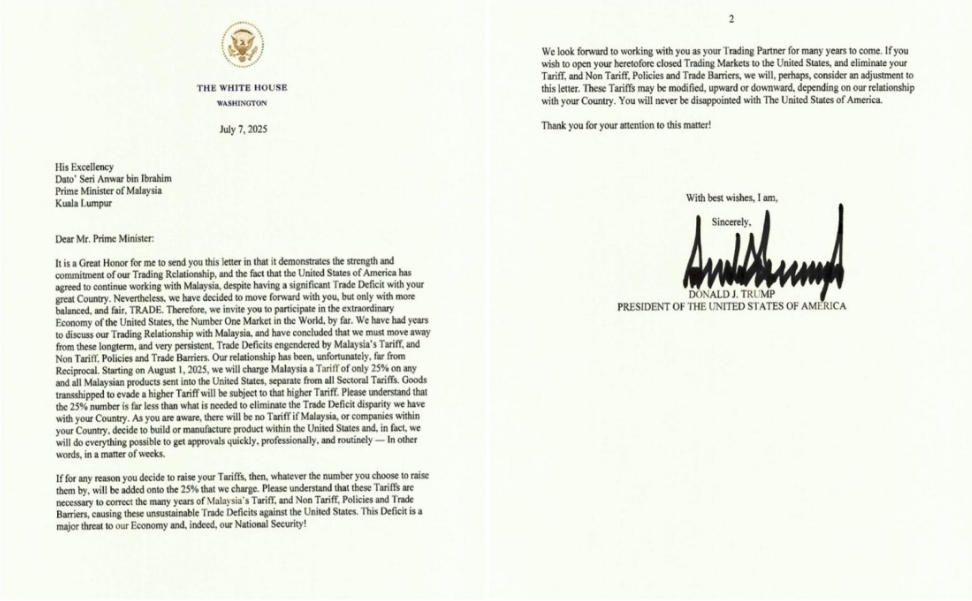 Amerika Syarikat mengenakan tarif lebih tinggi sebanyak 25 peratus ke atas semua produk Malaysia berkuatkuasa 1 Ogos tahun ini.