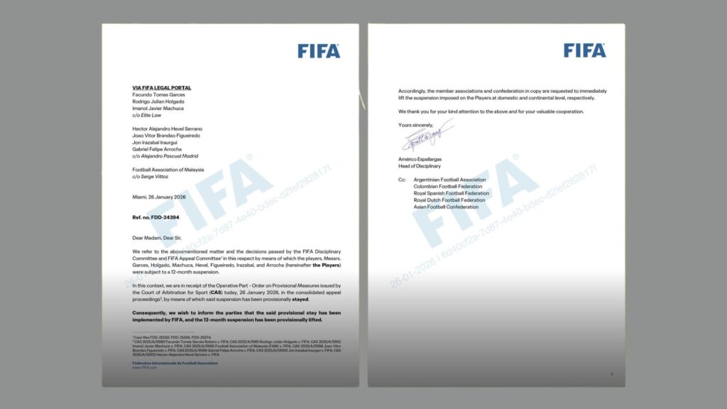 “Dilampirkan adalah maklum balas dari FIFA berkenaan keputusan CAS untuk membenarkan permohonan Penangguhan Pelaksanaan (stay of execution) yang dikemukakan oleh tujuh pemain pasukan kebangsaan iaitu Facundo Garcés, Rodrigo Holgado, Imanol Machuca, João Figueiredo, Gabriel Palmero, Jon Irazabal dan Héctor Hevel.